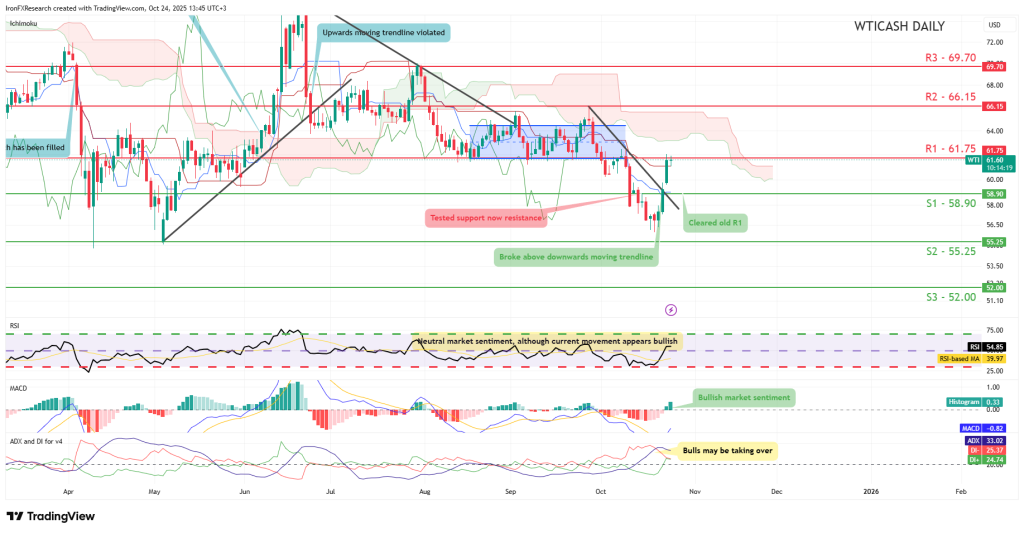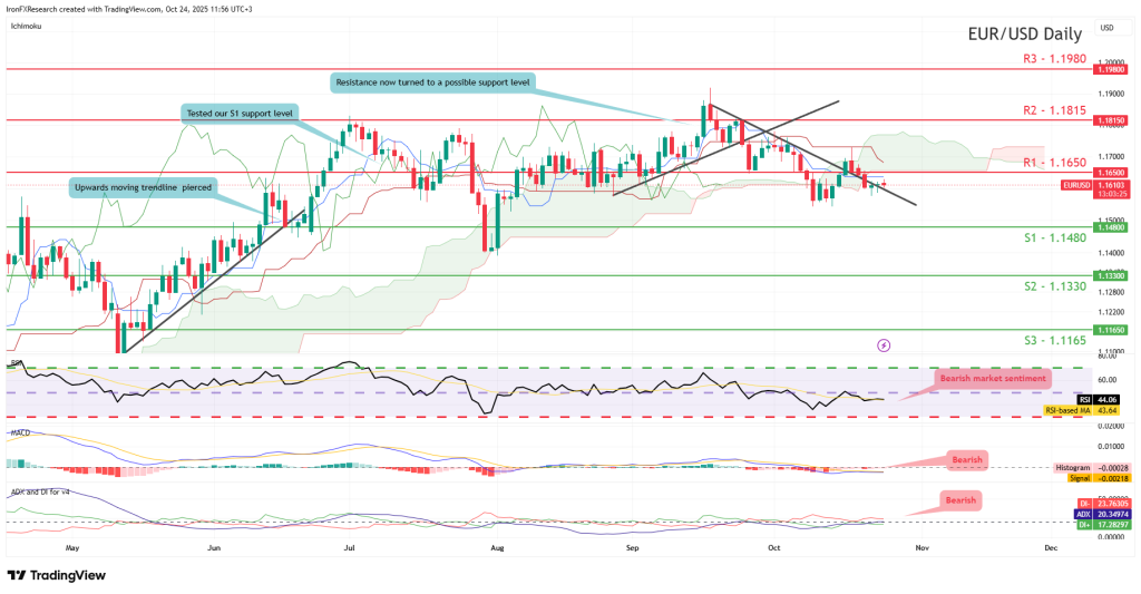 The Fed’s interest rate decision is set to occur next week and considering the lack of financial releases as a result of the ongoing US Government shutdown, market participants may face higher volatility than usual following the bank’s interest rate decision and the release of their accompanying statement. Moreover, the majority of market participants are currently anticipating the bank to cut rates by 25 basis points, with FFF currently implying a 96.7% probability for such a scenario to materialize. In our view we would not be surprised to see the bank cutting rates by 25 basis points considering how the labour market has significantly weakened recently. Yet we must stress that the Fed may be flying blind as it was announced that the bank had lost access to labour data provided by the ADP and considering the Government shutdown the Bureau of Labor Statistics has delayed releases, we also would not be surprised to see the Fed policymakers raising concerns over the state of the US economy and the hindrance to conducting appropriate monetary policy decisions should the shutdown continue. Overall, should the bank cut rates it may weigh on the greenback and for the particular pair we will analyse below, the ECB remaining on hold could provide the EUR with an edge over the dollar in the coming week.
